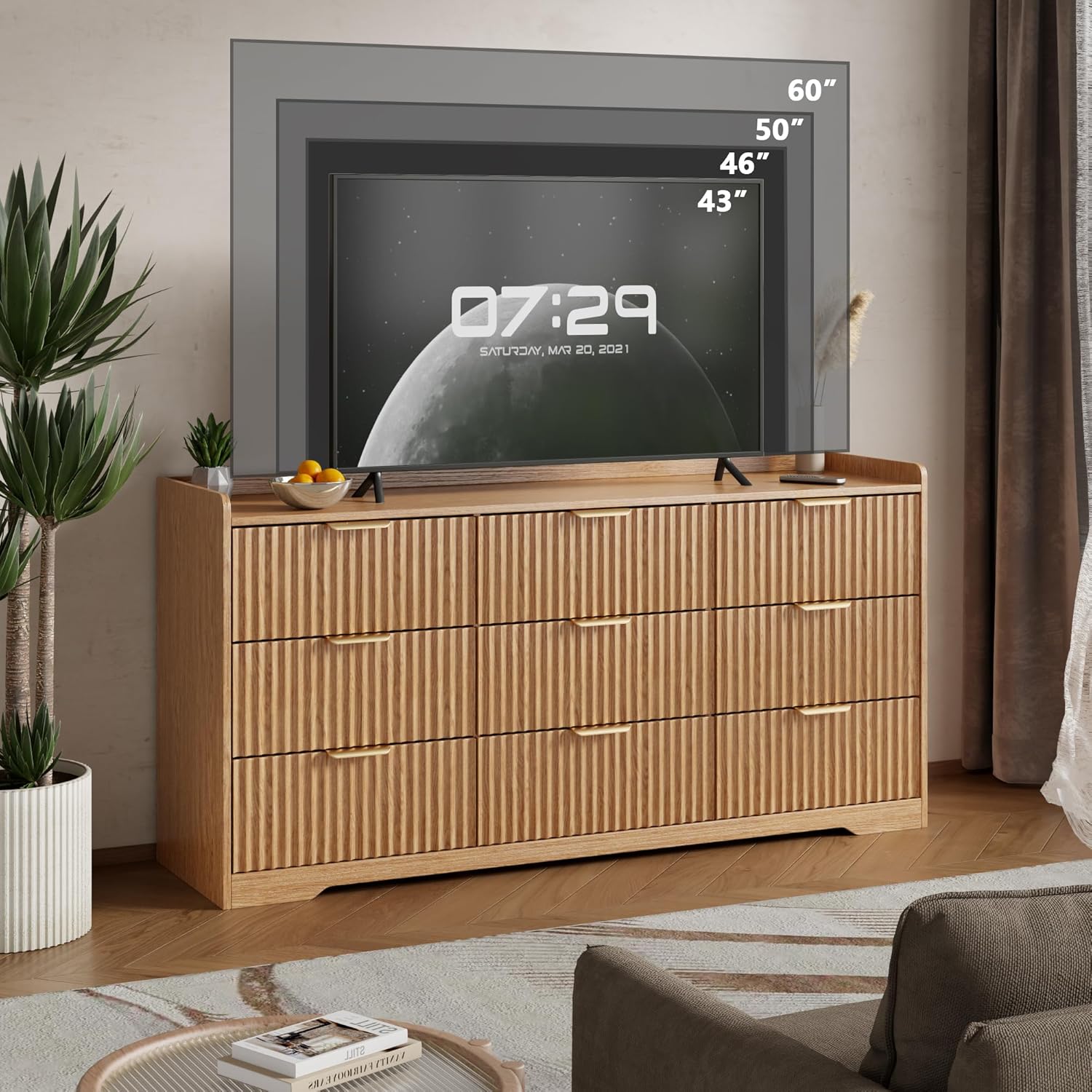 - Versatile Wood Dresser:The sleek fluted finish and wide wood frame enhance any decor—perfect as a bedroom dresser, entryway organizer, tv stand in living room or hallway storage solution.